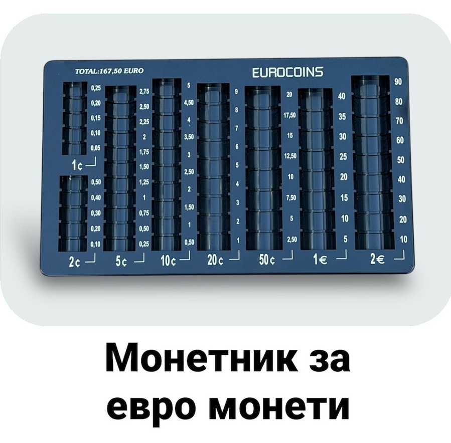Топ цена директно от производител ! Монетник за монети в евро. Пластмасов монетник за сортиране на всички видове еврови монети, изработен от удароустойчива пластмаса. Скала за броене на наличностите.
